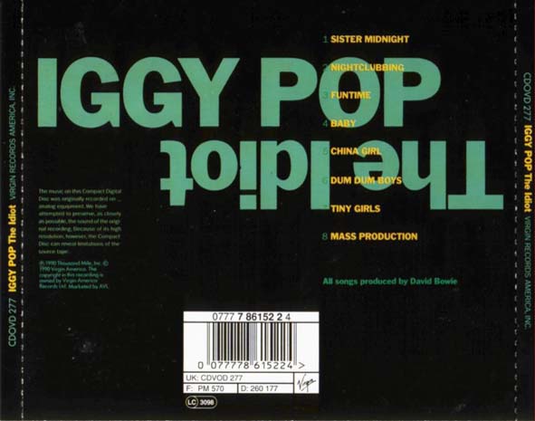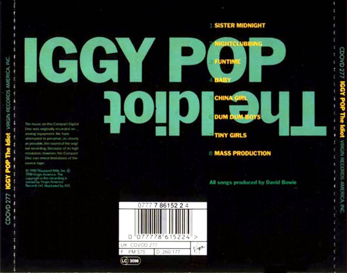 PERSONEL: Iggy pop (v), David machine), Phil Palmer(gtr), Carlos Alomar(gtr), Laurent Thilbault and george Murray(bass), Michel Santageli and Dennis Davis(drums) PRODUCER: David. Find a Iggy Pop The Idiot first pressing or reissue. Complete your Iggy Pop collection. Your browser does not currently recognize any of the video formats available. Click here to visit our frequently asked questions about HTML5 video. Todos quedaron absolutamente asombrados que Jim Ostedrberg, es decir Iggy Pop, se introdujera en el equipo de la gira Station to Station como si fuera uno ms de ellos. El guitarrista Carlos Alomar, que siempre ser el ms clido de todos los amigos de Bowie, fue el mejor embajador. 1977 IGGY POP THE IDIOT TOUR Opening on the 1st March 1977, The Idiot Tour visited three countries and produced of twentynine performances. Nightclubbing we're nightclubbing We're what's happening Nightclubbing we're nightclubbing We're an ice machine We see people brand new people They're someth Iggy Pop The Idiot Punk Wir bieten jedes Musikalbum und jedes Hrbuch kostenlos als Download an. Bei uns ist alles online, von den neusten Charts und Alben bis zu alten MusikKlassikern. The Idiot o lbum de estreia do cantor estadunidense Iggy Pop em sua carreira solo. Foi o primeiro de dois LPs lanados em 1977 onde Iggy escreveu e gravou com a colaborao de David Bowie. O ttulo do lbum foi inspirado no livro O Idiota, do escritor russo Dostoivski Iggy, Bowie e o produtor Tony Visconti gostavam do livro [1. O prprio Bowie regravou a faixa China Girl em. Find album reviews, stream songs, credits and award information for The Idiot Iggy Pop on AllMusic 1977 In 1976, the Stooges had been gone for two years. Find a Iggy Pop The Idiot first pressing or reissue. Complete your Iggy Pop collection. The Idiot est le premier album d'Iggy Pop sorti en 1977. C'est le premier volet d'une trilogie pour la maison de disques RCA, qui comprend The Idiot, Lust for Life et TV Eye Live 1977. Son titre est une rfrence au roman L'Idiot de Dostoevski. You look like someone who appreciates good music. Listen to all your favourite artists on any device for free or try the Premium trial. Play on Spotify The Idiot l'album di debutto come solista di Iggy Pop. uscito il 18 marzo 1977 per l'etichetta discografica RCA, prodotto da David Bowie Indice 1 Il disco The Idiot (. Iggy Pop We speak at length to the punk godfather about his past, the state of rock'n'roll, and the future of one of its most legendary bands. by: Bret Gladstone Iggy Pop gets out of the hospital and travels to Berlin, where David Bowie waits in an underground bunker of a studio. They write, record, and release a classic suite of drumheavy, nihilistic pop. Bowie would raid this record when he recorded Tonight a few years later. ClashMusic: Read a feature on the classic album, 'The Idiot' by Iggy Pop recorded with David Bowie in a studio known as Chteau d'Hrouville just outside of Paris in 1976. Iggy Pop song lyrics for album The Idiot. Tracks: Sister Midnight, Nightclubbing, Funtime, Baby, China Girl, Dum Dum Boys, Tiny Girls, Mass Production Idiot Iggy Pops first solo record, The Idiot, is equally a David Bowie album with a guest singercomposer; Bowie cowrote all of the songs, played many of the instruments and produced it (rather chaotically, requiring Tony Visconti to try and salvage the often overmodulated tapes at the mixing stage). The Idiot es el lbum debut como solista del msico estadounidense Iggy Pop, publicado el 18 de marzo de 1977 y producido por David Bowie. [1 El disco presenta un abandono del sonido hard rock de los anteriores trabajos de Pop con su banda the Stooges, siendo comparado particularmente con el sonido de lbumes como Low y Heroes del mismo Bowie, especialmente por la incorporacin de sonidos. Iggy Pop's The Idiot is one of the greatest rock and roll records created. Recorded in 1976 and released in 1977, this record found the complex friendship between two opposites, David Bowie and Iggy Pop, flower into artistic collaboration. Check out The Idiot by Iggy Pop on Amazon Music. Stream adfree or purchase CD's and MP3s now on Amazon. tHOSE links above aren't working, such a shame! Anyway, I already downloaded the full working album and I will share this to you guys cause. Find great deals on eBay for iggy pop the idiot and iggy pop the idiot cd. March 18 will see the release of Post Pop Depression (Rekords RekordsLoma VistaCaroline International), the 17th Iggy Pop album. The first Iggy Pop album cocreated. demusik: Iggy Pop Idiot jetzt kaufen. Pop, Alternative, Rock, Rock, Metal Hola amigos de el barbero loco hoy ha pedido de muchos amigos estare resabiendo los grandes exitos de este favuloso cantante, ms conocido por su nombre artstico, Iggy Pop es un actor y cantante de rock estadounidense. Es considerado uno de los mayores msicos innovadores en la creacin de nuevos gneros gestados en el rock tales como el punk rock, el postpunk, la new wave, el heavy. Iggy Pop The Idiot The Idiot is the debut solo album by American rock singer Iggy Pop. It was the first of two LPs released in 1977 which Pop wrote and recorded in collaboration with David Bo De leur travail naissent les deux albums solo d'Iggy Pop, The Idiot, puis Lust for Life, tous deux sortis en 1977 grce au crdit de David Bowie qui lui demande de faire la voix sur son album Low. Allan Gibbs, Camion Blanc: IGGY POP La menace intrieure; Iggy Pop. The Idiot ist das erste Soloalbum des amerikanischen Rocksngers Iggy Pop, das bei der Plattenfirma RCA erschienen ist. The Idiot is particularly interesting because it's Iggy showing off alterior sides to him. Every soul in the Berlin trifecta enjoyed a huge boost from collaborating with the others, and Iggy is no exception, here he has a huge boost from Bowie's aid on the sound of the thing. The Idiot Iggy Pop to stream in hifi, or to download in True CD Quality on Qobuz. com It is 40 years this month since Iggy Pops debut album, The Idiot, was first released
